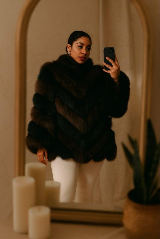 Confeccionado con piel sintética de zorro de alta calidad, este abrigo ofrece la suavidad de la piel auténtica sin crueldad animal. Su diseño de largo medio (65-80 cm) favorece cualquier silueta, manteniéndote abrigada sin sacrificar la libertad de movimiento ni el estilo.
