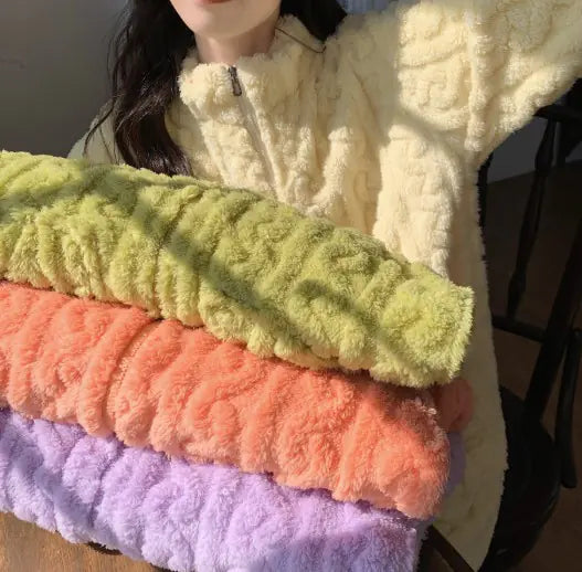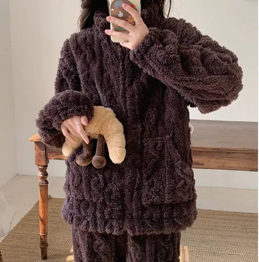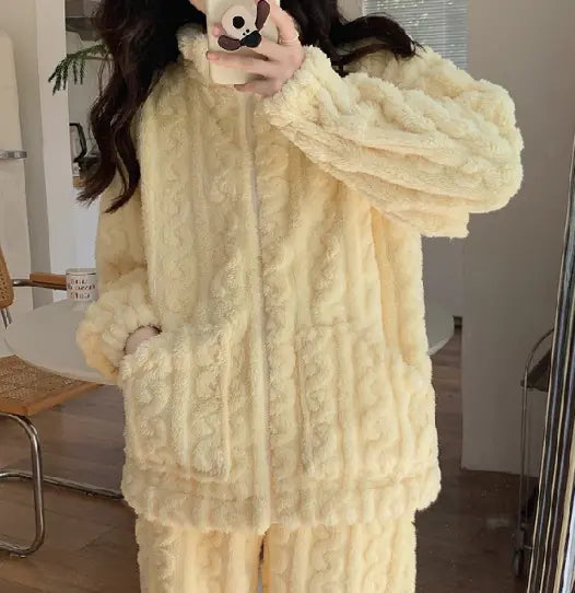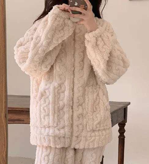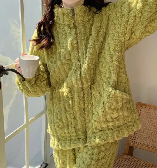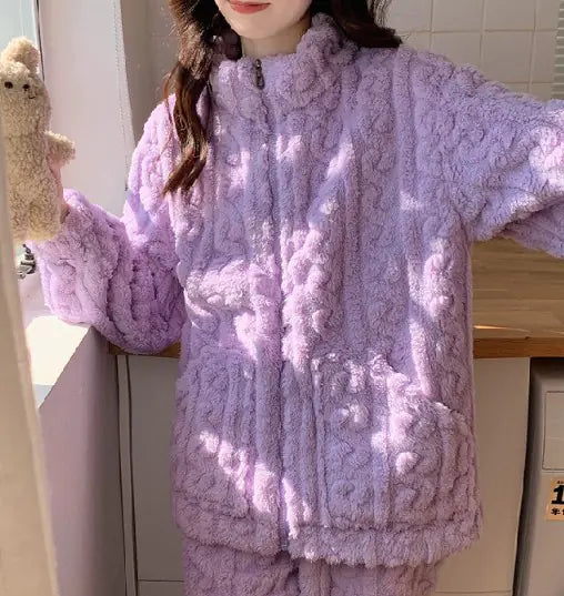Aura13 Women’s Velvet Jacquard Pajama Set – Coral Plush Zipper Loungewear for Cozy Elegance